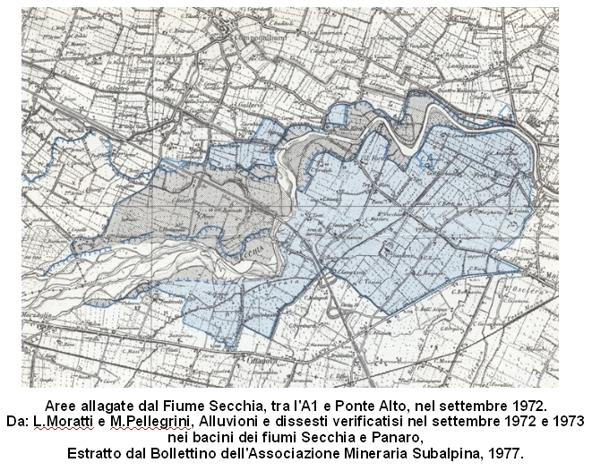 Gli eventi alluvionali. Le alluvioni della pianura modenese, dovute soprattutto a rotte e tracimazioni dei fiumi Secchia e Panaro, hanno interessato nel Novecento oltre 37.000 ettari di territorio. Tali eventi si sono concentrati negli ultimi 40 anni del secolo. Gli anni più critici per Modena sono stati il 1966, 1969, 1972, 1973. Nel 1966 la superficie allagata dal fiume Secchia è di 7.000 ettari, quella allagata dal fiume Panaro è di 9.400 ettari, per complessivi 16.400 ettari allagati. Si tratta della più estesa area colpita in tutto il secolo. Dopo qualche anno, tra il 10 e il 16 Settembre 1972, la Provincia di Modena è di nuovo colpita, anche in questo caso con ingenti danni all’agricoltura, alle infrastrutture e agli insediamenti, dalla rotta del fiume Panaro in località Gorgo Tre Frati, e dalla tracimazione di Panaro e Secchia in più punti.