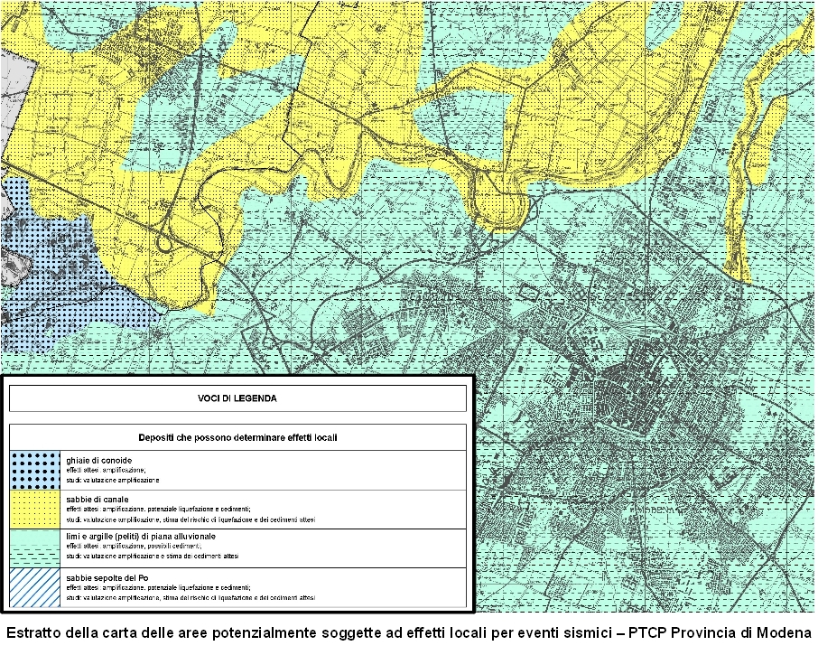 Il terremoto più recente, del 15 ottobre 1996, ebbe epicentro a Bagnolo in Piano (R.E.), con intensità 7° grado della scala Mercalli (magnitudo 4.8 della scala Richter), seguita dopo poche ore da un’altra scossa del 6° grado della scala Mercalli. A Modena produsse gravi danni agli edifici storici come il Palazzo dei Musei, il campanile di San Domenico e il Cimitero Monumentale; vi furono cadute di comignoli in centro storico, la Ghirlandina oscillò, si crearono crepe al Policlinico, e ci fu un fuggi-fuggi all’ipermercato Grand’Emilia, con grandi danni, ma per fortuna senza nessuna vittima.Se ad oggi i terremoti non si possono prevedere, è possibile però conoscere, statisticamente, quale intensità è verosimile attendersi per il nostro territorio, quale frequenza temporale tale sismicità potrà avere e, soprattutto, quali sono i terreni e le morfologie che possono amplificare o smorzare l’intensità del sisma, con la possibilità di prevedere anche quali effetti essi possono determinare sulle strutture. Questo diviene di fondamentale importanza per la pianificazione territoriale ed infatti il Piano Territoriale di Coordinamento Provinciale (PTCP) della Provincia di Modena, approvato nel 2009, contiene diverse tavole in cui vengono zonizzati i terreni suscettibili di amplificazione sismica, in cui sono da attendersi determinati effetti locali e nei quali le nuove costruzioni potranno essere realizzate solo dopo aver eseguito particolari indagini geofisiche e geologiche.