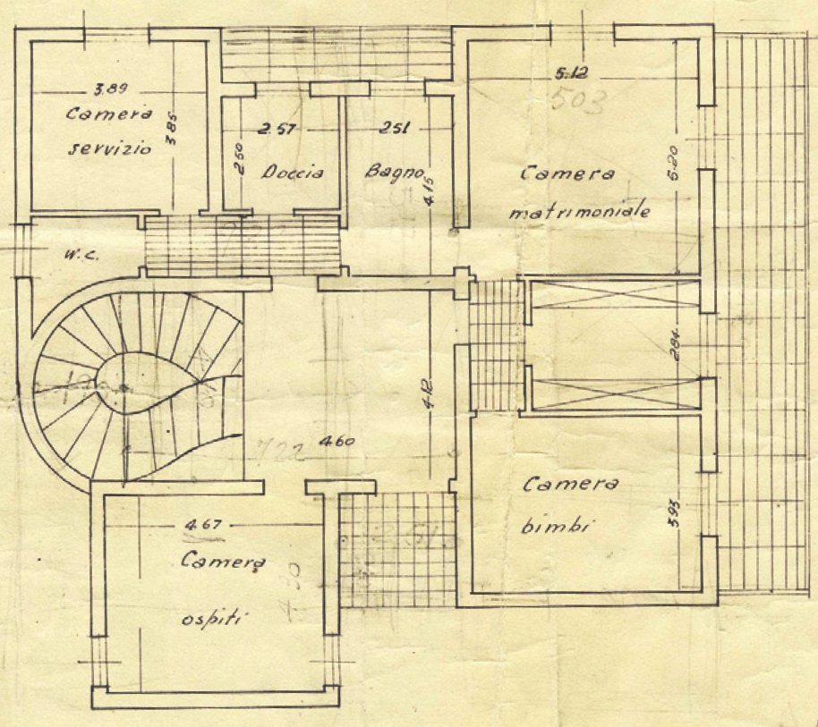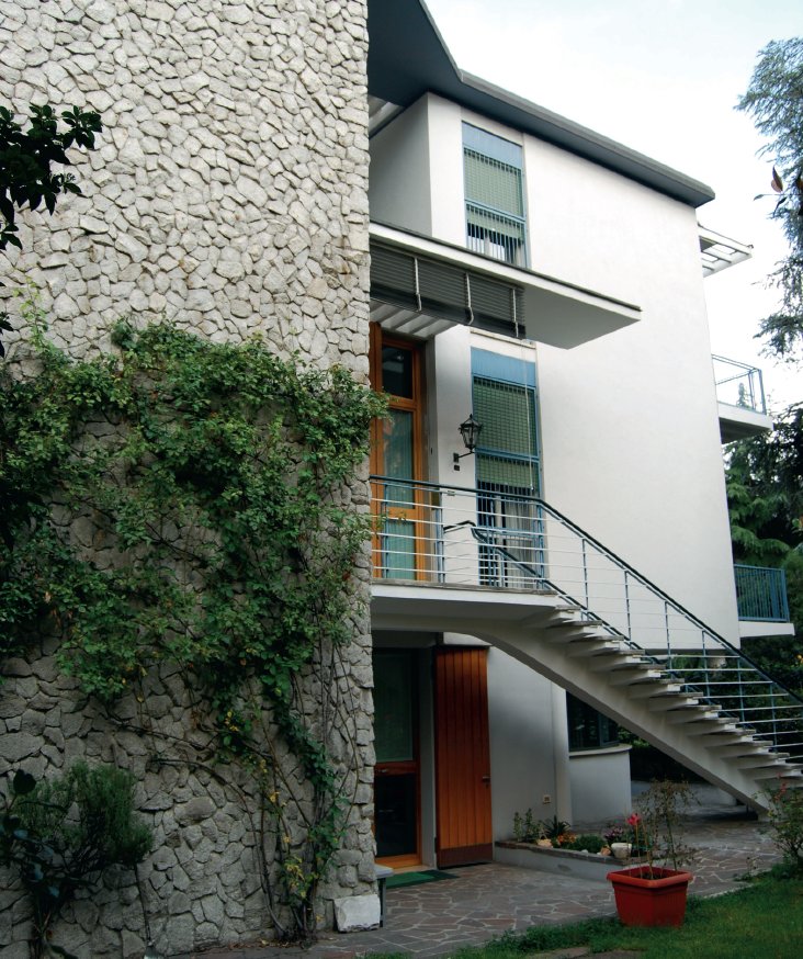 Pare che proprio un episodio relativo al progetto per la casa di Pierluigi Remaggi sia all’origine della decisione di Vecchi di riprendere gli studi interrotti a causa della guerra: pur avendo sviluppato la gran parte del progetto, Vecchi non potrà firmare le tavole in quanto non ancora professionista (si laureerà solo nel 1952 al Politecnico di Milano). Il contributo personale dei singoli architetti è tuttavia di difficile individuazione. Sicuramente, rispetto agli asciutti e raffinati progetti degli anni trenta di Pucci, come casa Gavioli ad esempio (1935-37), il vocabolario si è fatto più vario, e le soluzioni adottate, anche nella scelta dei materiali, più sofisticate. Il volume, apparentemente semplice nella sua forma scatolare, viene in realtà disarticolato, innanzitutto dallo svuotamento del piano terra, sospeso su esili pilotis. Ma anche la parete curva del garage, così come quella del vano scala in vetrocemento, mostra una maggior disinvoltura e un allontanamento dall’ortodossia razionalista degli anni Trenta. La scelta dei materiali è altrettanto originale: l’uso del rivestimento in granito a opus incertum (simile non a caso a quella della demolita Casa del Popolo di Vignola di Vecchi) caratterizza la parete cieca prospettante viale Medaglie d’Oro e le pareti di tamponamento dei balconi, mentre l’elegante scala padronale che conduce all’appartamento di rappresentanza presenta degli scalini a lastre, e come la già citata scala interna, a spirale e a sbalzo, diventa un vero e proprio gesto scultoreo. La pensilina, il trasparente “graticcio” in calcestruzzo armato sovrastante il balcone del secondo piano, tutto rimanda a un’idea di leggerezza e permeabilità tipica degli anni cinquanta.