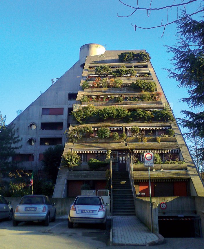 Rispetto al progetto iniziale del 1975 la variante del 1977 ha introdotto alcune modifiche, prima fra tutte l’eliminazione di una serie di logge circolari a sbalzo sullo spigolo esterno. I tre blocchi sono caratterizzati da un uso generalizzato del cemento a vista: le logge, le finestrature e gli oblò sono trattati come tagli fortemente espressivi. Il sapiente controllo del rapporto fra la forte immagine esterna e la complessa articolazione planimetrica interna fa di questo progetto una delle più riuscite variazioni sul tema della megastruttura tanto in voga negli anni Settanta.
