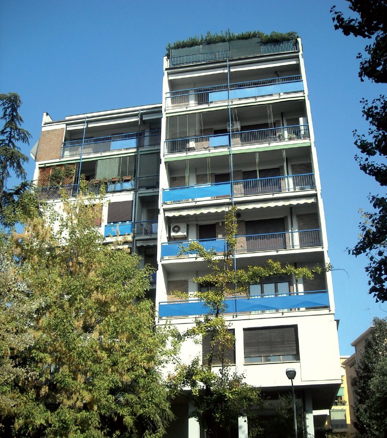 Costruito fra il 1955 e il 1957 su progetto di Manfredo Vaccari Giglioli è commissionato da Carlo Lucchi e Walter Vignali, questo complesso ad appartamenti si colloca in una zona dove l’edilizia più ricorrente è di carattere estensivo, dominata per lo più dalla tipologia del villino unifamiliare con giardino. Secondo le nuove mode in voga, nel secondo dopoguerra assistiamo tuttavia a una cospicua produzione di edifici multipiano dedicati a classi agiate. Vaccari, che realizza diversi esempi di tale tipologia, fra cui occorre citare anche il complesso ad appartamenti di viale Virginia Reiter 31 del 1958, è senza dubbio assieme a Vecchi uno dei professionisti più prolifici di questi anni. Nell’edificio di viale Medaglie d’Oro egli pare quasi voler replicare, dilatandolo, uno schema già sperimentato in tutt’altra tipologia, come quella della casa unifamiliare. Analogamente a quanto accade in casa Nardini, una scala a unica rampa diventa elemento dominante del prospetto. In questo caso l’effetto è potenziato dalla collocazione di questo elemento in asse con l’ingresso e dalla maggiore altezza del portico, che attraverso un libero reticolo strutturale in calcestruzzo armato si sviluppa per due piani fuori terra. Una delle pareti rivestite in laterizio di questo spazio filtrante fra esterno e interno accoglie inoltre alcuni elementi decorativi astratti in ceramica rossa. L’aerea scala conduce a un primo pianerottolo, dove sono collocati alcuni uffici, per poi distribuire al vero e proprio corpo attraverso una scala condominiale. L’edificio presenta una planimetria a “L” e appartamenti di cospicue dimensioni, mentre i prospetti sono animati da un controllato gioco di pieni e vuoti potenziato dalle numerose e profonde logge.