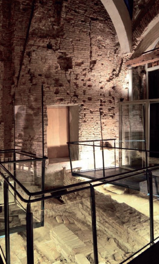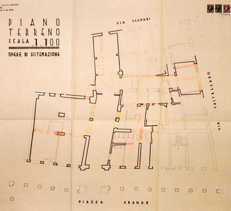 In questo contesto si inserisce anche il progetto di restauro e rifunzionalizzazione dei locali posti al piano terra sul lato settentrionale del portico, per la realizzazione di un nuovo ingresso al Palazzo Comunale, oggi adibiti a ufficio del turismo. Un percorso su passerella sospesa permette di attraversare la sala lasciando visibili i segni delle trasformazioni in tutte le epoche storiche di questo spazio, originariamente occupato dal basamento della cosiddetta “Torre Mozza”, l’originaria torre civica risalente alla prima edificazione del palazzo alla fine del X secolo.