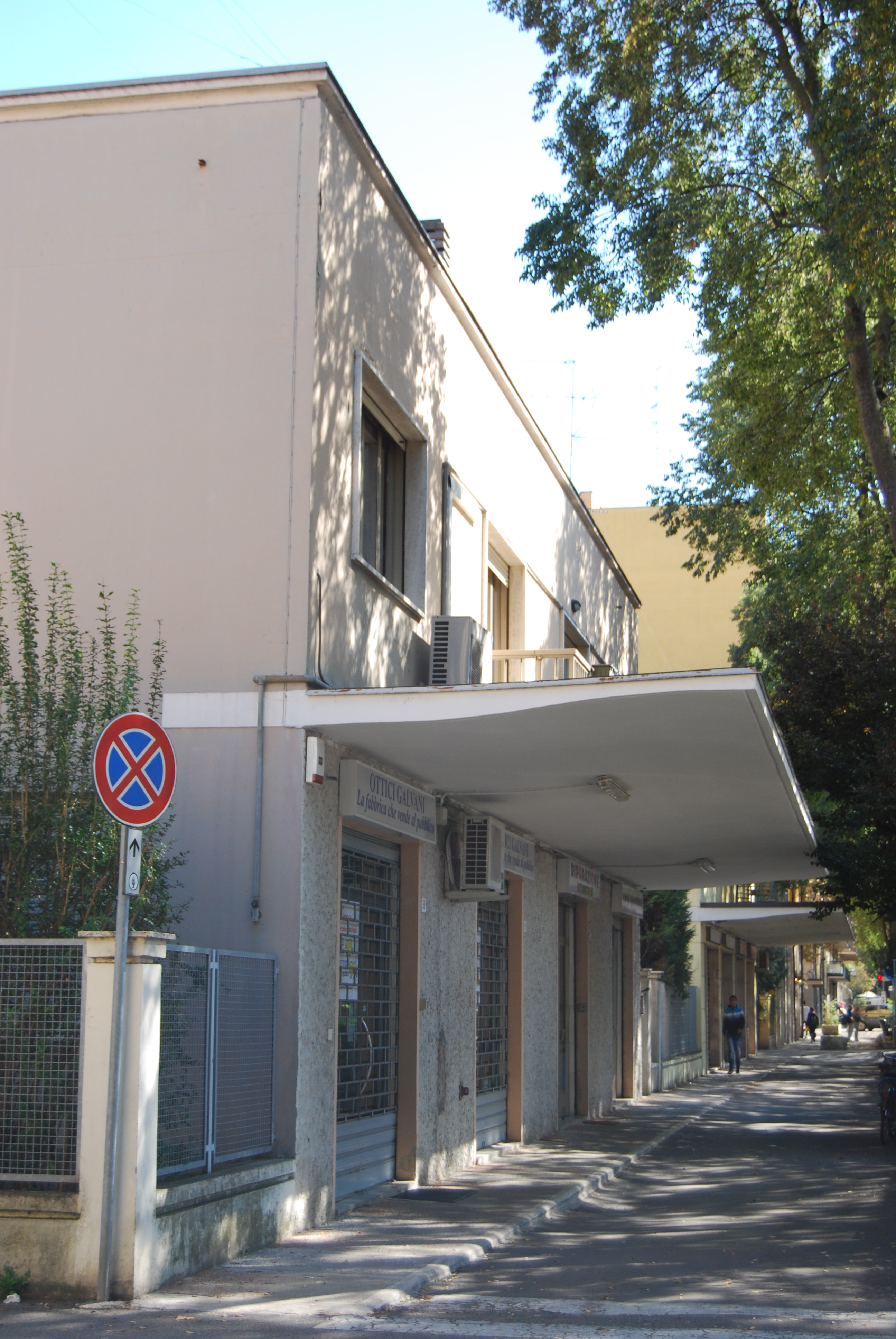 Il lato su viale Storchi si caratterizza per la sequenza di piccoli edifici a due piani dal volume semplice e destinati a casa-bottega, che definiscono il carattere di strada commerciale che tutt’ora mantiene, accentuato dalla citazione del portico di un primo progetto non realizzato, rappresentato dalla pensilina leggermente inclinata, che crea un ambito protetto sul fronte strada.