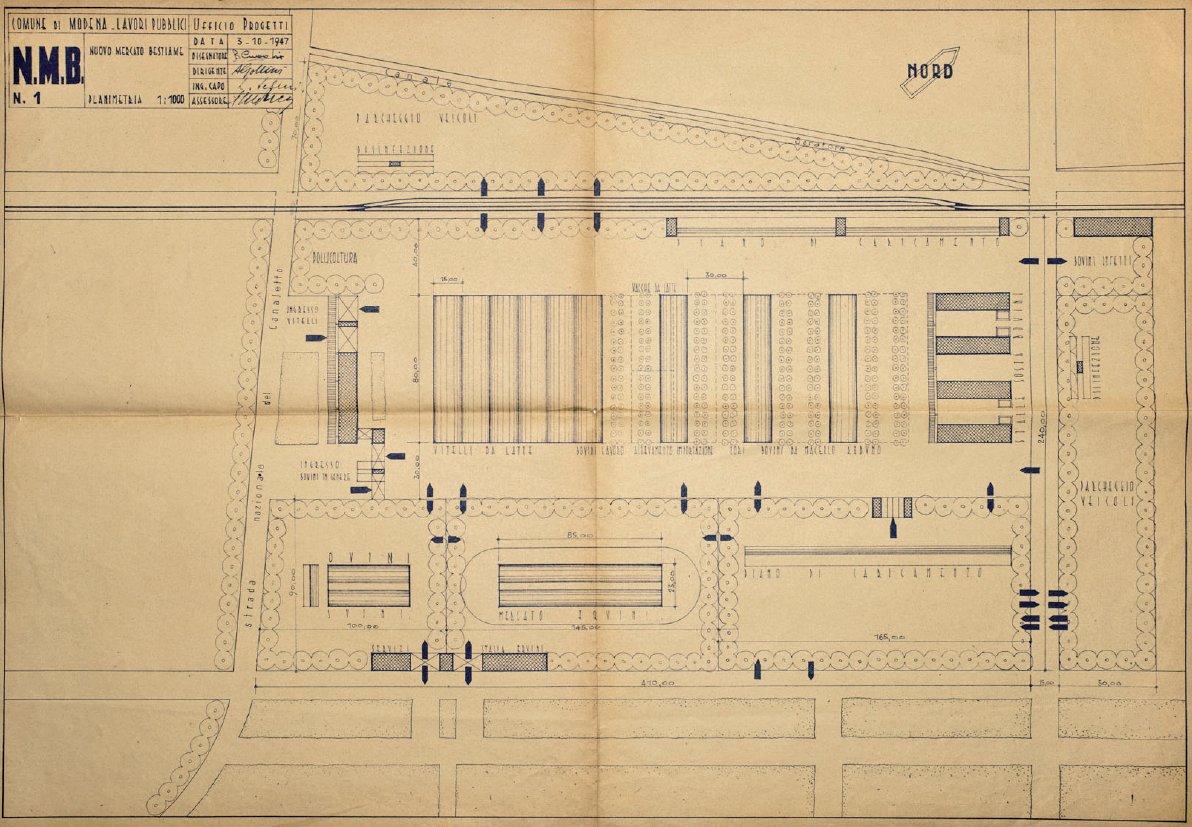 Inaugurato dal sindaco Alfeo Corassori nel 1951 e progettato dall’allora assessore ai Lavori Pubblici Mario Pucci, il mercato bestiame si presenta come una fondamentale infrastruttura necessaria allo sviluppo di un settore centrale per l’economia modenese dell’epoca. Oltre ad ampliare lo spazio destinato alle attività di contrattazione, suddivisione e ricovero dei capi, si aggiunge infatti una grande centrale di macellazione che favorisce la formazione di una serie di industrie, per la lavorazione dei residui di macellazione e per la produzione di farmaci ormonici.