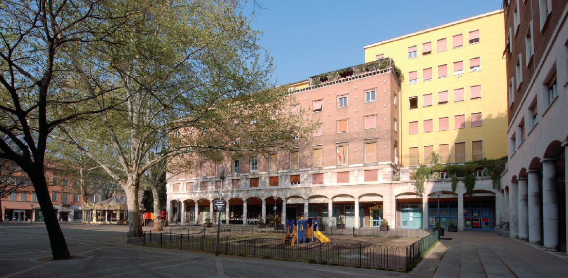 Sebbene contenuta nelle direttive del piano di risanamento al pari degli sventramenti di piazza XX Settembre, la realizzazione di piazza Matteotti risulta essere più complessa e si protrae per quasi tutta la prima metà del Novecento. Dopo il primo progetto del 1913 redatto dall’ing. Parisi dell’ufficio tecnico comunale, bisogna attendere l’iniziativa del podestà nel 1933 per avviare a opera dell’ing. Zaccaria le prime demolizioni e l’accordo con lo IACP, che avvia la realizzazione del quartiere di case popolari in Villa S. Caterina destinato a una parte degli sfollati. Dopo una serie di progetti non realizzati che andavano a mutare sostanzialmente l’aspetto della piazza, come quello che prevedeva la realizzazione di un edificio sul fronte della via Emilia o il concorso per la sede della Cassa di Risparmio, nel 1939, a seguito dell’accordo con l’Istituto delle Assicurazioni acquirente dell’area, si definisce la soluzione redatta dagli architetti Corrado Corradini di Modena e Mario Loreti di Roma, autore di importanti progetti in collaborazione con figure quali Sergio Musmeci e Cesare Valle. Essa prevede la costruzione sui lati occidentale e settentrionale della piazza di due edifici porticati di tre piani composti da razionali elementi trilitici che tentano di conciliare le esigenze di rappresentatività con la ricerca di un linguaggio moderno.