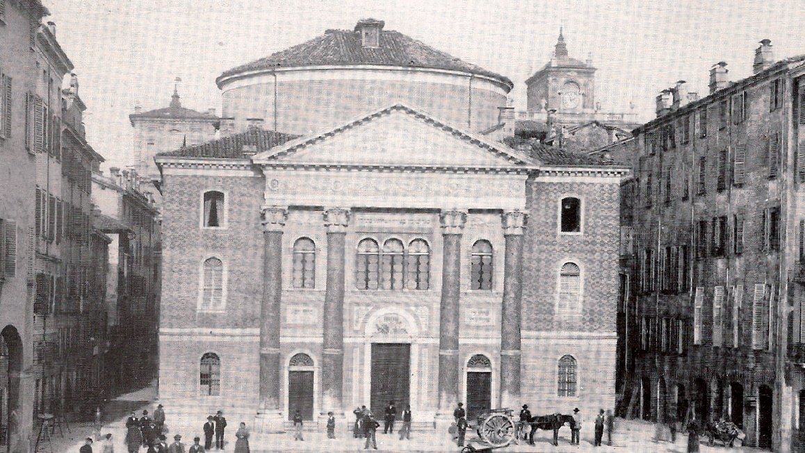 Il vuoto urbano della piazza aperto a sud lungo la via Emilia trova la sua quinta di fondo sul lato opposto nel fronte della sinagoga costruita dall’ingegnere Ludovico Maglietta nel 1873, caratterizzata dalla facciata conclusa a timpano e sorretta dal doppio ordine gigante di colonne. Si manifesta in tal modo la presenza, fino ad allora nascosta dalla densità edilizia, del luogo simbolo della comunità ebraica, presente in quest’area del centro storico dal 1638 per volontà del duca Francesco I d’Este.