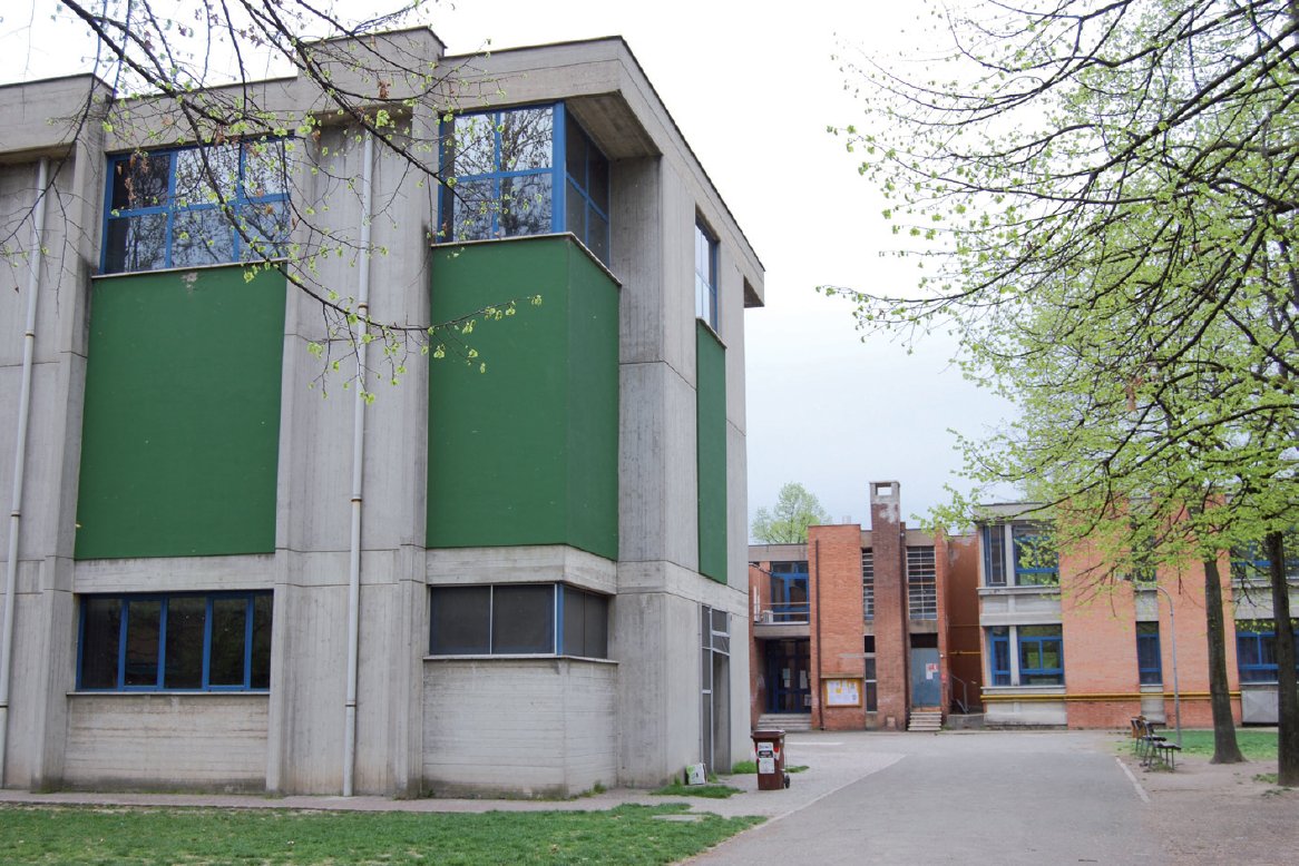 Il primo corpo dalla forma a “U” ospita l’atrio nella parte di collegamento e nei corpi lunghi sia al piano terra che al primo, mentre le aule sono distribuite da un corridoio rivolto all’interno nella corte che si viene a formare tra i due corpi. Al blocco delle aule è collegato un secondo volume che comprende spogliatoi e ambulatorio e al piano superiore la biblioteca e la sala insegnanti. Da questo si accede al terzo volume, posto perpendicolarmente al precedente, che costituisce la testata della scuola in direzione nord in cui si trovano la mensa al piano terra e la palestra al primo. La composizione della pianta produce una varietà dei prospetti, caratterizzati dall’uso del calcestruzzo armato a vista e dell’intonaco. I volumi delle aule presentano ampi vuoti rappresentati dalle finestre a tutta luce che occupano il passo delle campate tra i pilastri. Gli altri sono suddividi secondo una partitura continua che accentua maggiormente la verticalità composta da fasce alternate di superficie cieche in cemento e finestre.
