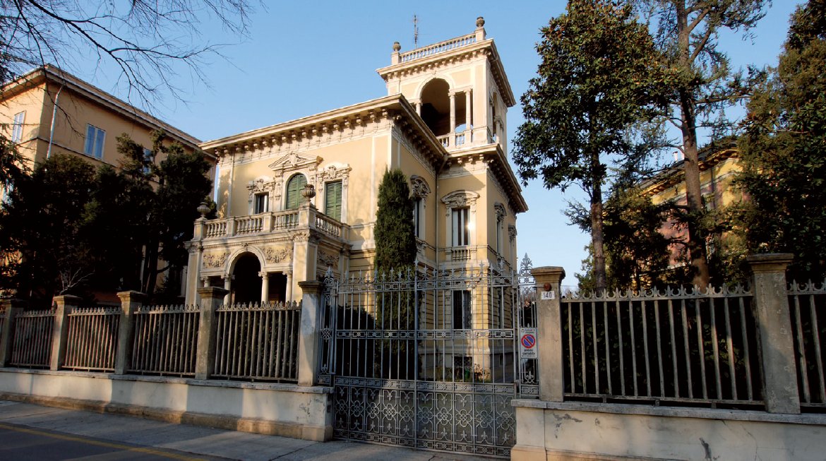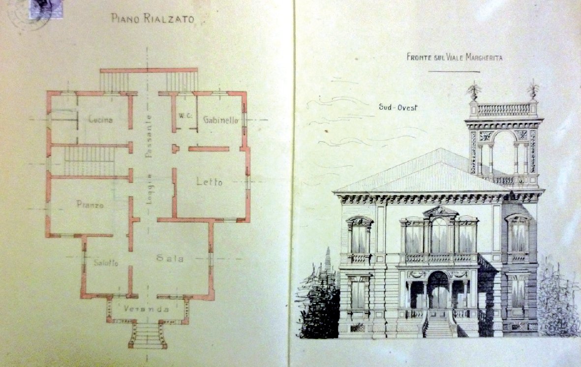 La composizione trova nell’elemento di coronamento, la torretta, completamente traforata nuovamente da un motivo a serliana, uno sbilanciamento del volume dal lato sud-est; ancora, la compattezza del volume presenta un ulteriore elemento di variazione nella asimmetria del piano di facciata dei fronti laterali, che produce sui due lati differenti arretramenti del volume centrale dell’edificio.