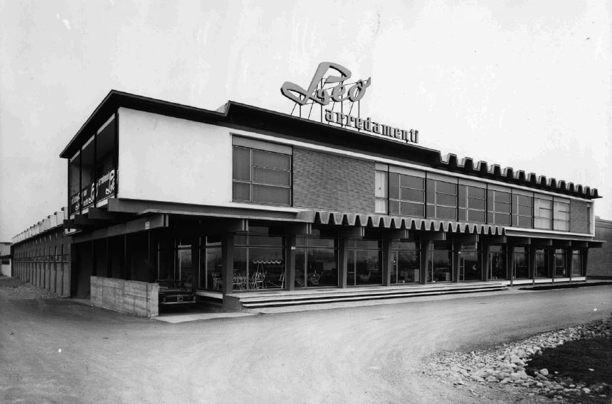 Secondo una prassi compositiva ormai consolidata nella produzione dell’autore, in relazione alla progettazione di complessi destinati all’industria, l’edificio si compone di un corpo sviluppato in profondità del lotto, destinato alla produzione e di uno a due piani, aggettante rispetto al primo e ruotato di 90 gradi, a costituire la testata sul fronte su via Emilia ovest. Il piano terra di quest’ultimo corpo, destinato all’esposizione, è quasi interamente trasparente, con superfici vetrate che occupano interamente la luce tra un pilastro in cemento e l’altro. Sopra ciascuno di questi, fortemente sporgenti a sostenere la balconata superiore, travi binate mostrano, attraverso il disegno del dettaglio, uno dei motivi formali dell’edificio, caratterizzato da un aspetto “costruttivo”, visibile anche nel motivo grecato di una porzione di soletta, tanto del piano primo, quanto di copertura. Tale aspetto è ancora messo in evidenza, nell’accentuazione della figura dell’esagono, che disegna le finestre dei fronti longitudinali del corpo destinato alla produzione. Al centro del prospetto la finestra di forma esagonale allungata è tagliata dal nastro orizzontale della finestra in lunghezza. Lo stesso motivo geometrico si trova poi a ridosso della copertura, dove conforma i lucernari che sporgono di metà figura, oltre la linea di gronda. La soletta asseconda uno dei lati inclinati, risvoltando in uno sporto orizzontale interrotto, che non rigira sul lato obliquo opposto e caratterizza la copertura per la sequenza dei profili zigzaganti in cemento.
