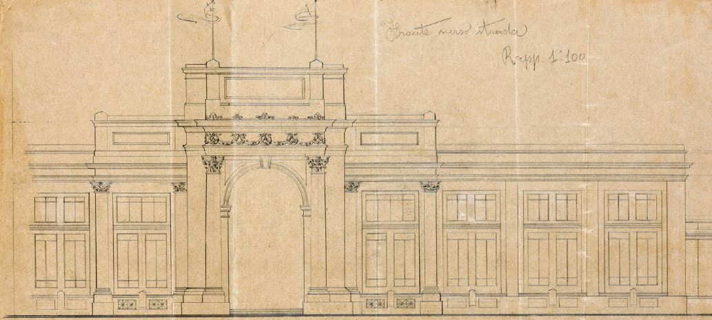 Figura 1 - Prospetto del progetto originale della palazzina uffici, 1913. (ASCMO, foto P. Pugnaghi)
