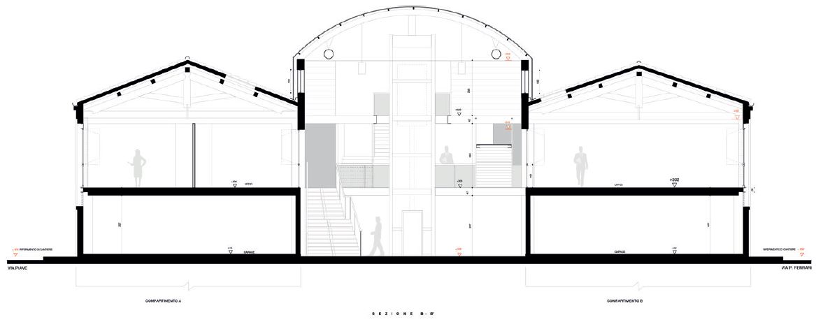 Figura 3 - Sezione trasversale del progetto di recupero, con in evidenza lo spazio centrale a tutt’altezza. (Studio Claudio De Gennaro)