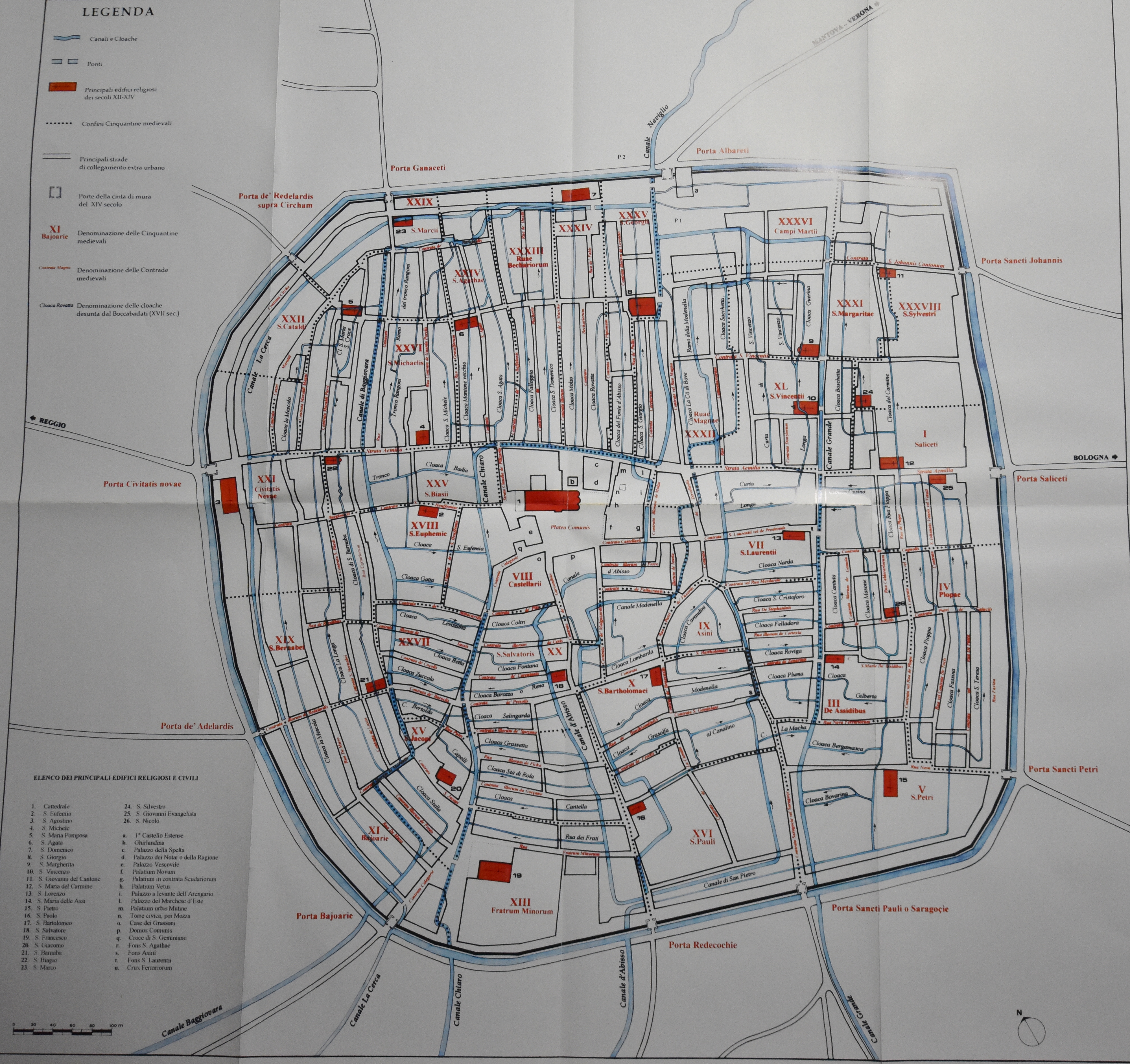 La carta, in assenza di una cartografia storica della città dell'epoca, la cui produzione in forma completa avverrà solo a partire dal XVII° secolo, si pone come strumento utile alla comprensione delle trasformazioni urbane dell’epoca e successive. Questa ricostruzione del centro storico sottolinea aspetti fondativi della città storica contemporanea come il reticolo idraulico, gli edifici di culto e la maglia stradale che caratterizzano isolati, spazi pubblici e la suddivisione dell’abitato (cinquantine). La carta è stata prodotta in occasione della giornata di studi “L’Urbanistica di Modena Medievale (X – XV secolo). Interrelazioni, confronti e approfondimenti”, curata da Enrico Guidoni e Catia Mazzeri e organizzata a Modena il 3 dicembre 1999. Nel 2001sulla base degli atti del convengo è stato pubblicato l’omonimo volume.
